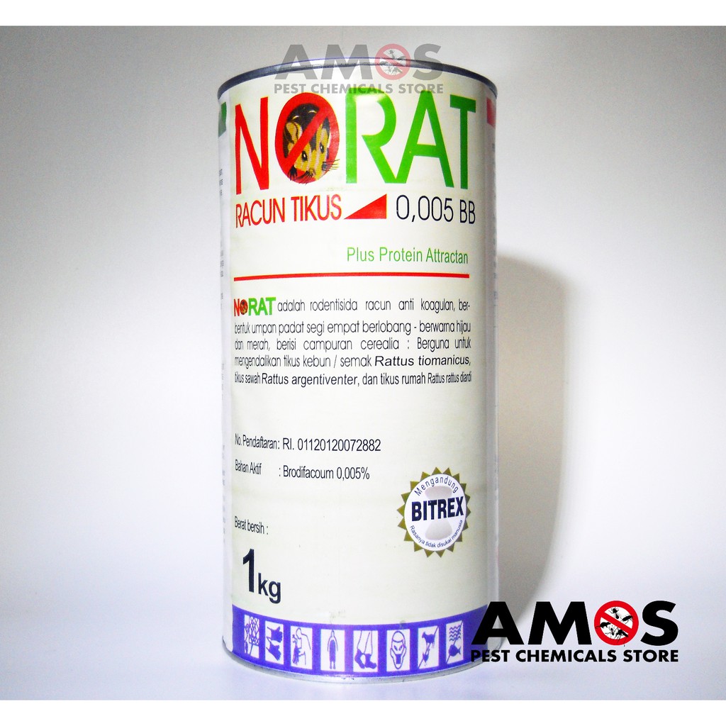 Norat 0,005 BB adalah rodentisida atau racun tikus anti koagulan, berbentuk umpan padat segi empat berlobang - berwarna hijau dan merah, berisi campuran cerealia.Fungsi Norat 0,005 BB :Mengendalikan tikus kebun / semak Rattus tiomanicus, Tikus Sawah Rattus argentiventer, dan Tikus Rumah Rattus rattus Diardi.Cara Penggunaan Norat 0,005 BB :Letakkan 1-2 buah umpan dalam jalur/jalan tikus atau di depan lubang aktif. Dosis 0,4-0,8 kg umpan per hektar tau 100-200 buah umpan per hektar.Formulator : NPCANo. Pendaftaran : RI.01120120072882Bahan Aktif : Brodifakum 0,005%Isi Bersih :
