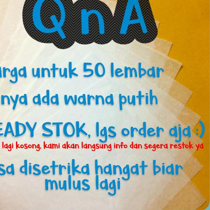 UPDATE April 2019 : Kertas tisu saat ini tersedia dalam bentuk paket isi 50 lembar. Kertas tisu atau tissue paper berguna untuk membungkus atau melapisi produk anda, memunculkan kesan rapi dan mewah, produk tampil lebih cemerlang dan memukau. Teksturnya adalah kertas, bukan seperti tisu wajah atau spun bond (bahan totebag), juga bukan kertas baking atau kertas roti. Kertas ini sangat tipis, memberi kesan lembut dan halus tetapi tanpa menambah berat paket.Ukuran 30 x 55 cm ini cocok untuk ukuran lipatan baju standar, sepatu, kain, pecah belah dll dsb. Tersedia juga dalam ukuran lain, 60 x 55 dan 60 x1