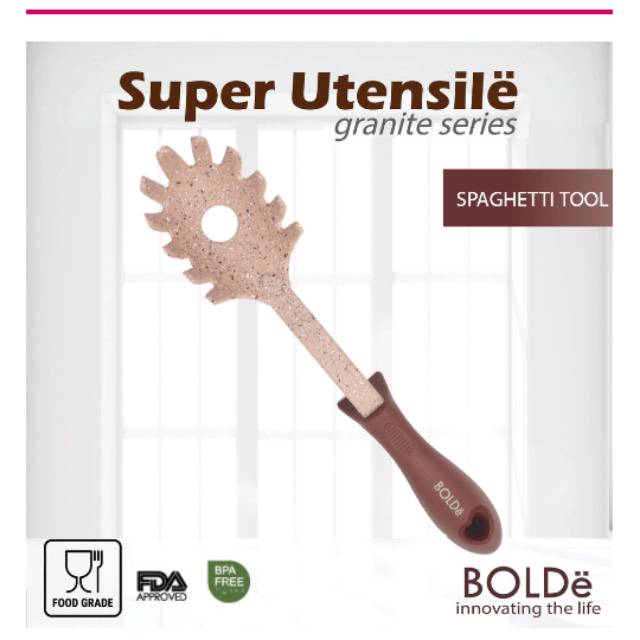 Pertama di Indonesia peralatan utensil dengan graphic granite corak.Sangat cocok untuk digunakan di produk Super PAN dari BOLDeTerbuat dari bahan FOOD GRADE Nylon yang dijamin bebas BPA / PFOA dan bahan kimia berbahaya lainnya.Mudah dibersihkan serta aman digunakan untuk mesin pencuci piring otomatis.Tidak akan membuat goresan di peralatan masak.Tahan panas hingga 220' derajat celcius.Dilengkapi gantungan sehingga memudahkan Anda menyimpan.Note : peralatan masak ini tidak boleh dibiarkan diatas peralatan masak yang sedang panas secara terus menerus tanpa