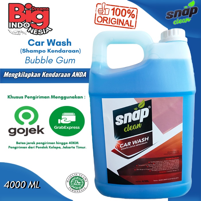 PRODUK SELALU READY, LANGSUNG AJA DIORDER KAKA :DPENTING!INFO JAM PENGIRIMAN :INSTAN SAMPAI JAM 4 SORESAMEDAY SAMPAI JAM 3 SOREPENGIRIMAN SENIN SAMPAI SABTU (MINGGU / TANGGAL MERAH LIBUR)[Peraturan Order]Dikarenakan peraturan order pihak layanan online delivery GOJEK DAN GRAB yang melakukan pembatasan berat dan ukuran pada setiap pengiriman maka kami PIHAK SELLER hanya bisa melakukan pengiriman sebagai berikut :Gojek dan Grab Layanan Instant Delivery : Maksimal 10 Galon .Gojek dan Grab Layanan Sameday Delivery : Maksimal 4 Galon.Bila pesanan melebihi Peraturan Order diatas kami akan tetap mengirimkan pesanan pembeli dengan batas maksimal dan sisa uang pembeli akan di kembalikan. Terima Kasih[Deksripsi Produk]CARWASH SNAP CLEANCarwash yg diformulasikan khusus untuk membersihkan dan mengkilapkan kendaraan.Sertifikasi :1. IJIN DINKES PKRT NO : 440/001-SPKRT/DPMTSP/0L/20182. MSDS (Sertifikat Keselamatan)3. Halal4. SUCOFINDOSpesifikasi :1. 4 Liter / GALON2. Hanya Memiliki 1 Varian Yaitu Bubbl