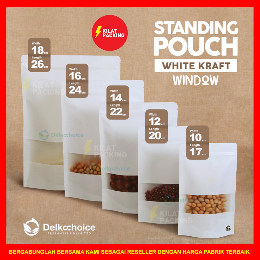 Distributor Perlengkapan di Kabupaten Bondowoso Standing Pouch Varian Kraft Putih Window / Plastik Zipper Ziplock Kemasan Aneka Snack Murah Satuan dari Kilatpacking Kota Jakarta Utara