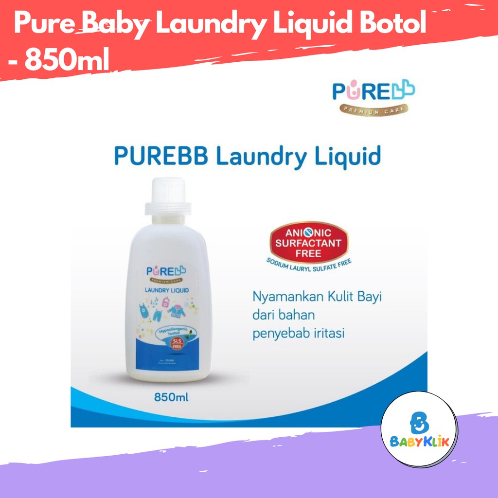 Pure bb Laundry Liquid Bottle 850mlPure bb Laundry Liquid Adalah cairan pembersih pakaian bayi dengan formulasi bebas detergen (Sodium Lauryl Sulphate Free). Membersihkan dan mengangkat kotoran pada pakaian bayi dengan kandungan bahan mild. Dilengkapi dengan ekstrak Aloe Vera untuk melembutkan. Aman untuk kulit bayi yang sensitif. Dilengkapi dengan Anti Bacterial dan Anti Fungi.Kandungan Pure bb Laundry Liquid :Kandungan Laundry Liquid adalah terdapat ekstrak Aloe Vera untuk melembutkan. Aman untuk kulit bayi yang sensitif. Dilengkapi dengan Anti Bacterial dan Anti Fungi.Benefit Pure bb Laundry Liquid :- Tanpa bahan Detergen SLSSekalipun merupakan bahan pencuci pakaian (detergen) , Purebaby Laundry Liquid Tidak mengandung bahan Detergen SLS (sodium laurly sulfate) dengan formulasi MILD.- Hypoallergenic , Anti Bakterial dan FungiPure bb Laundry Liquid teruji Hypoallergenic karena menggunakan bahan mild dan Tanpa bahan Detergen SLS juga Anti bacterial dan Fungi dengan Aloe vera.- Melembutkan Pakaian BayiPure bb Laundry Liquid dengan kandungan Aloe vera juga berfungsi untuk memberikan kelembutan pada pakaian bayi.#babyklik_purebb #babyklik_purebaby #perlengkapanbayi #tokoperlengkapanbayi #babyklik #babystuff #babyshop #grosirperlengkapanbayi #babyonlineshop #babyshopindonesia #purebb #purebaby #babycare #produkpurebb #purebbindonesia #wipes #shampoo #babywash #sabunbayi #sampobayi #hairlotion #lotion #babycream #liquidsoap #laundryliquid #liquidcleanser #purekids #puremom #toothpaste #distributorp