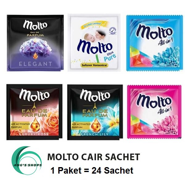Molto Pewangi sachet Pembelian Per 24 PcsBerat bersih 11 ml per pcsPelembut dan pewangi pakaian konsentrat dengan keharuman 5X Wangi Cerah Luar Biasa, dilengkapi dengan Formulasi 3D: Cerah Mengagumkan, Keharuman Istimewa, Kelembutan Ekstra 5X Wangi Cerah Luar Biasa, 3D Formulasi, Cerah Mengagumkan: Melindungi warna pakaian sehingga tampak cerah lebih lama, Keharuman Istimewa: 5X lebih wangi memikat yang tahan hingga 14 hari, Kelembutan Ekstra: Merawat serat pakaian sehingga terasa halus dan lembut Bila produk habis akan di gantikan dengan sejenis nya dengan aroma berbeda. Tanpa di beritahukan sebelumnya kepada pembeli. No return no komplain. #pewangipakaian #pakaian #kebersihan #perlengkapandapur #murah #pewangi #molto #motolalinone #pewangitambahan #segar #pelembutpa