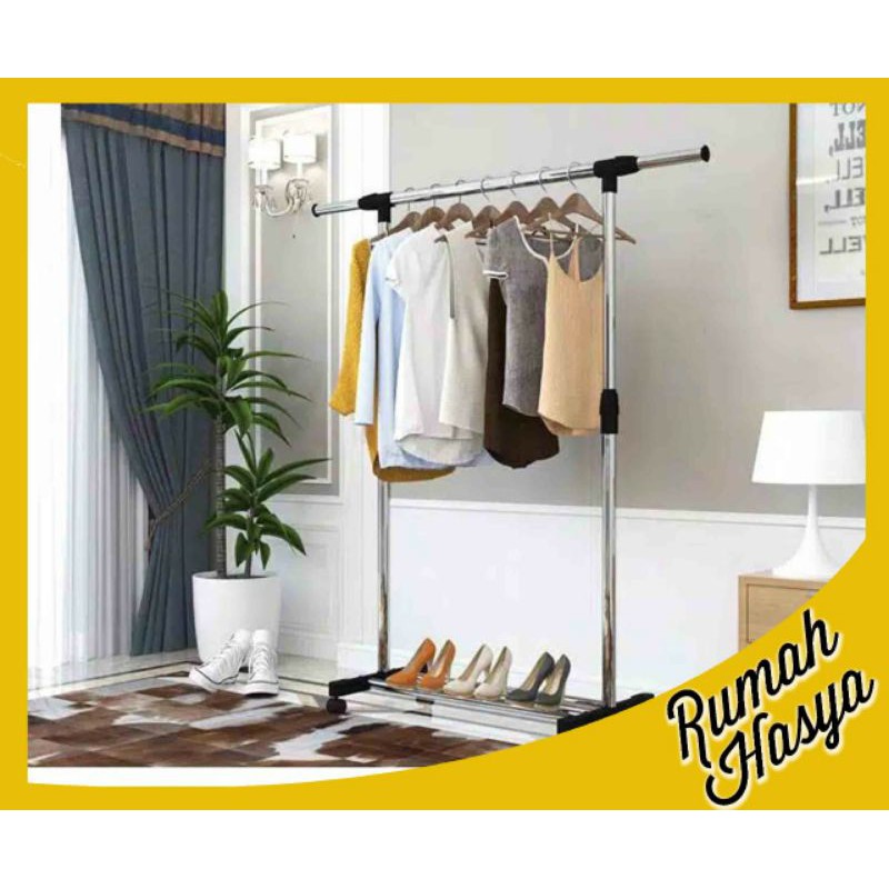 Stand hanger single rak gantung pakaian serbagunaGantungan multifungsi dengan design modern dan portable. Mudah dibuka dan dipasang.Bisa untuk gantungan pakaian, tas, jas, topi, dasi, aksesoris dan lainnya yang dapat digantung. Model standing lebih modern dan hemat tempat, bisa dipakai di rumah atau kantor dll.- Bisa pakai untuk jemuran, dapat didorong masuk ke dalam rumah, cepat dan aman- Dilengkapi dengan 4 roda sehingga rak gawang bisa digeser sesuka hati- Lebar maksimal 155cm. Tinggi maksimal 155cm- Terbuat dari bahan stainless steel bisa dipakai untuk jangka waktu lama, kuat, kokoh dan anti karat. Pemasangan sangat mudah.- Pipa kanan-kiri bisa dipanjangkan Ukuran :Tinggi : 52 cmLebar : 15 cmBahan : Stainless Steel + plas