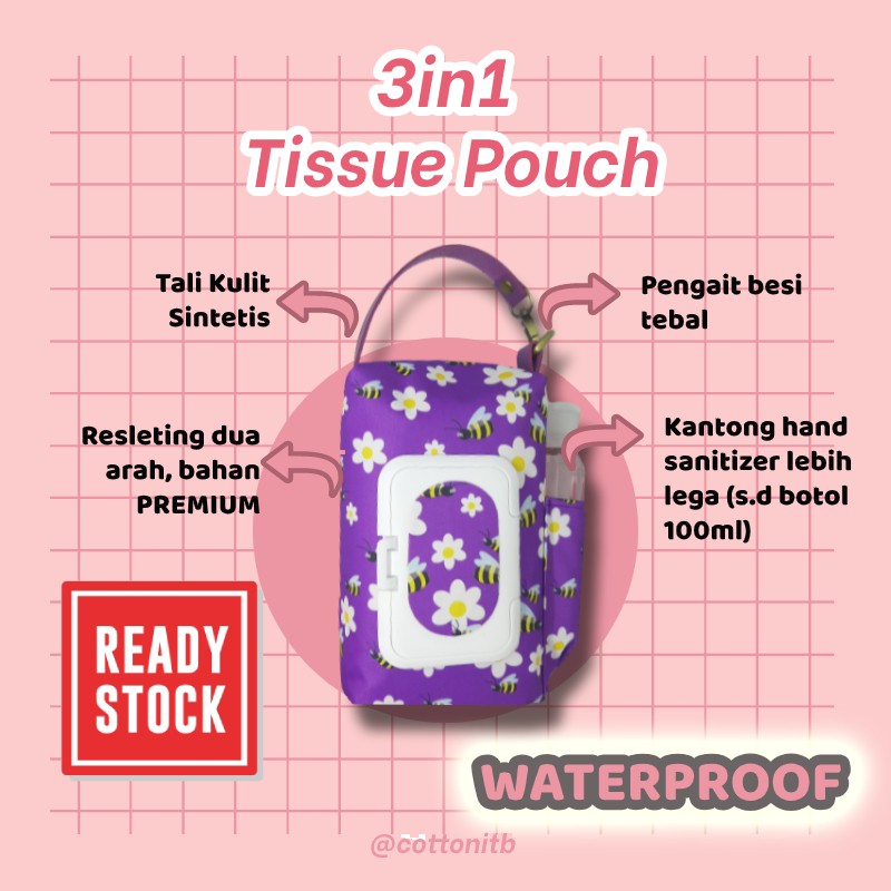 Pouch Tissue 3 in 1 dengan Kantong Hand Sanitizer untuk pilihan motif lain, silahkan cek produk lainnya yaREADY STOCKStock update ya, langsung beli saja ya, ga pakai nunggu lamaKualitas PREMIUM sesuai harga, harga sesuai manfaat ya kakakSekarang ini kebersihan tangan nomor 1 ya, Kak. Supaya jauh-jauh dari virus jahat.3in1 Tissue Pouch ini simpel banget, bisa digantung di mobil, di tas, di dinding, bahkan bisa diletakkan di atas meja. Jadi gampang kalau mau ambil tissue basah, tissue kering dan hand sanitizerPembelian termasuk:- Pouch- Tissue Basah 50sheet- Tissue Kering 50sheetCheckout maksimal jam 12 dikirim di hari yang sama yaaCottonitb juga menyediakan tissue kering, tissue basah dan hand sanitizer dengan harga terjangkau, silahkan check di produk lainnya yaaTerima kas
