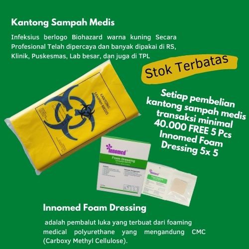 ThumbnailAtur jumlah dan catatan1Stok 200Tambah CatatanSubtotalRp2.000Lihat Performa IklanUbah ProdukKantong Sampah Medis Ukuran 40 x 60 cm Transaksi 40.000 Bonus 90.000Rp2.000DetailInfo PentingKondisi: BaruBerat: 300 GramKategori: Kantong SampahEtalase: Semua EtalaseKegunaan Kantong Sampah Medis Pribac 50 Mikron (ukuran 40 x 60) Kantong Sampah Medis Infeksius berlogo Biohazard warna kuning Secara Profesional Telah dipercaya dan banyak dipakai di RS, Klinik, Puskesmas, Lab besar, dan juga di TPL.Kegunaan Innomed Foam Dressing adalah pembalut luka yang terbuat dari foaming medical polyurethane yang mengandung CMC (Carboxy Methyl Cellulose).Indikasi :- Luka dengan eksudat sedang-berat- Luka full thickness atau partial thickness- Luka decubitus- Luka diabetes- Luka bakar- Donor sites dan vena leg ulcerNote : Sale pembelian Kantong Sampah Medis minimal transaksi 40.000 Free 5 Pcs innomed Foam 5