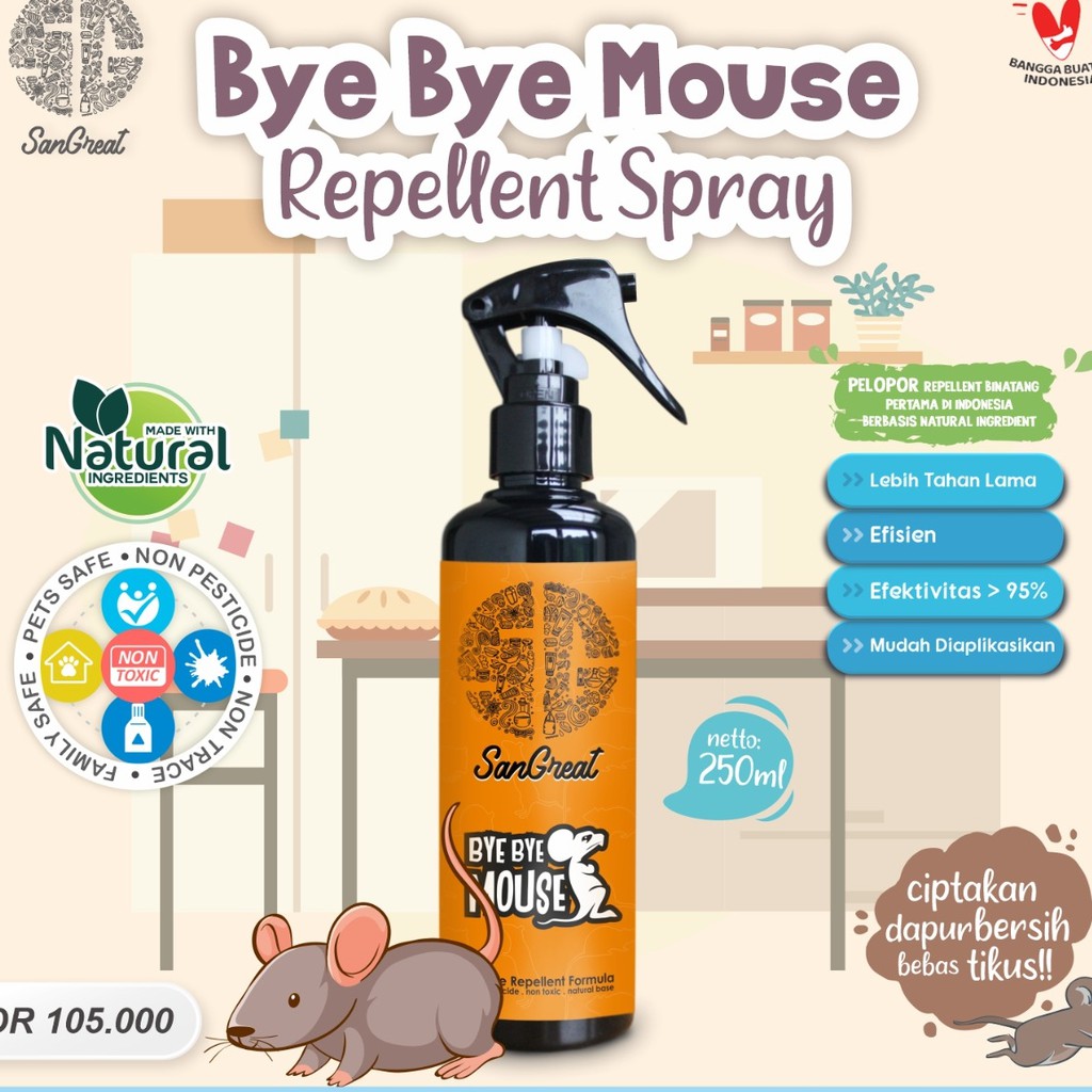 Deskripsi Pengusir Tikus SanGreat Bye Bye Mouse Spray 250 ml aman wangiPengusir Tikus SanGreat Bye Bye Mouse Spray 250 ml aman wangiBye Bye Mouse adalah essensial oil yang diformulasikan khusus sebagai repellent tikus.Sebagian besar tikus tidak suka wangi Bye Bye Mouse. Sehingga tikus akan pergi dari tempat yg tercium wangi Bye Bye Mouse.Bye Bye Mouse bukan racun, tidak membuat tikus mati. Sehingga tidak akan ada bangkai tikus yang membuat rumah bau bangkai tikus dimana-mana.Bye Bye Mouse aman untuk keluarga dan binatang peliharaan.Fungsi Bye Bye Mouse:Memecah teritori tikusMengusir tikus tanpa membunuhMencegah tikus mendekati atau memasuki areal tertentu (rat repellent)Cara pakai:Bye Bye Mouse Spray1 . Semprotkan Bye Bye Mouse spray ke tempat yang sering dilalui tikus atau persembunyian tikus2. Sebaiknya disemprotkan menjelang malam, saat tikus beraktifitas.2.semakin sering disemprot pada area yg sering dilalui tikus atau persembunyian tikus semakin membuat tikus enggan lagi bersembunyi di area tersebutWarning: Efek Bye Bye Mouse mungkin tidak sama untuk setiap ti